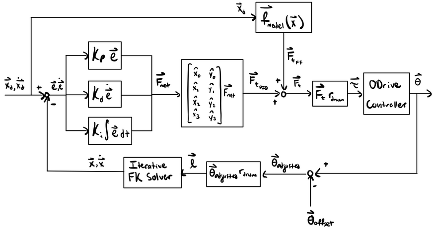 In this control system, position and velocity errors generate a 2D force in the workspace plane, which is then broken down into the 4 specific cable contributions. The tensions from the PID controller are added to estimated tensions from a feedforward model that estimates the tensions based on end-effector position. The sums of the PID and feedforward tensions are converted to torques and sent to the ODrive controller (shown below).