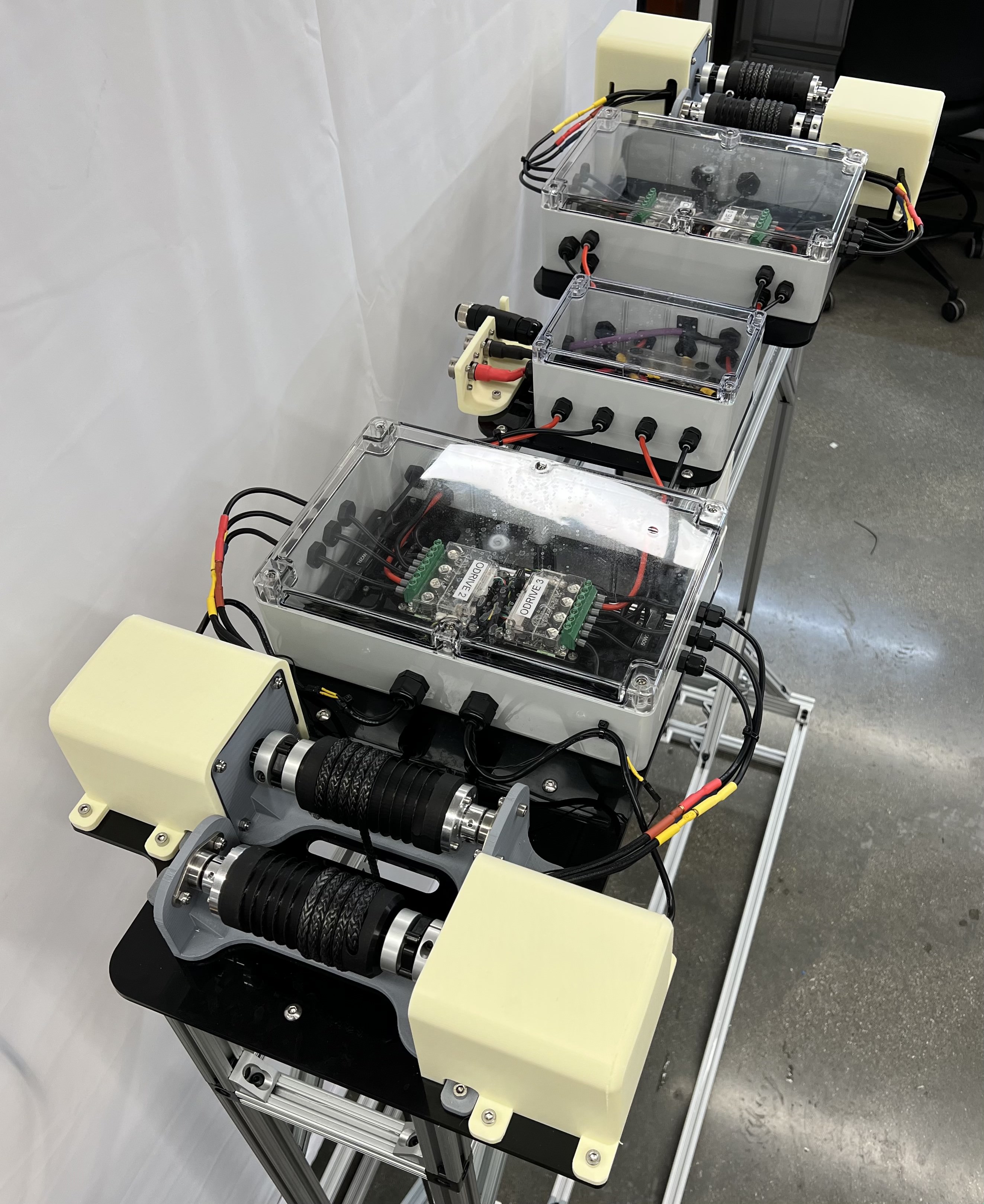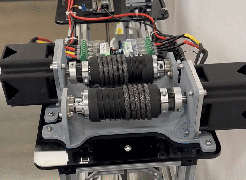 In terms of modeling, the main components of interest of this design are the motor-drum asseblies that are used for winding and unwinding the cables. The drums are threaded, which allows for predictable winding and unwinding of the cables. These drums have heat-set inserts that are used to mount the shaft collars, which then secure the drums to the shafts that are coupled with the motors.