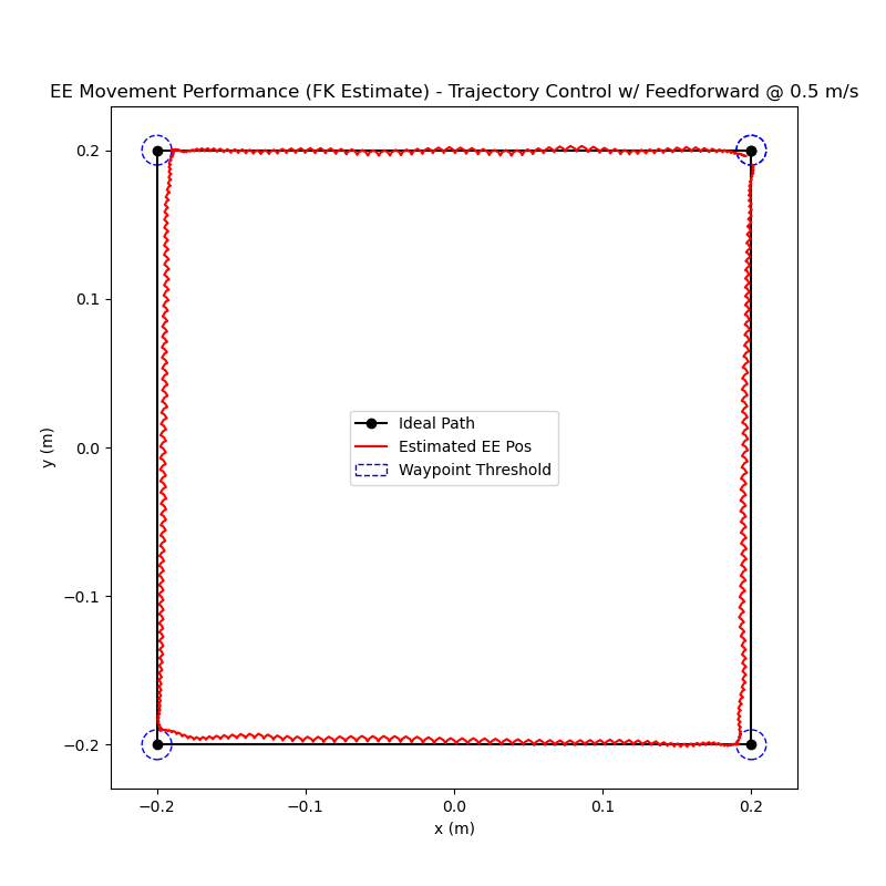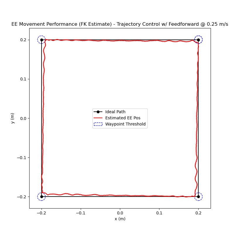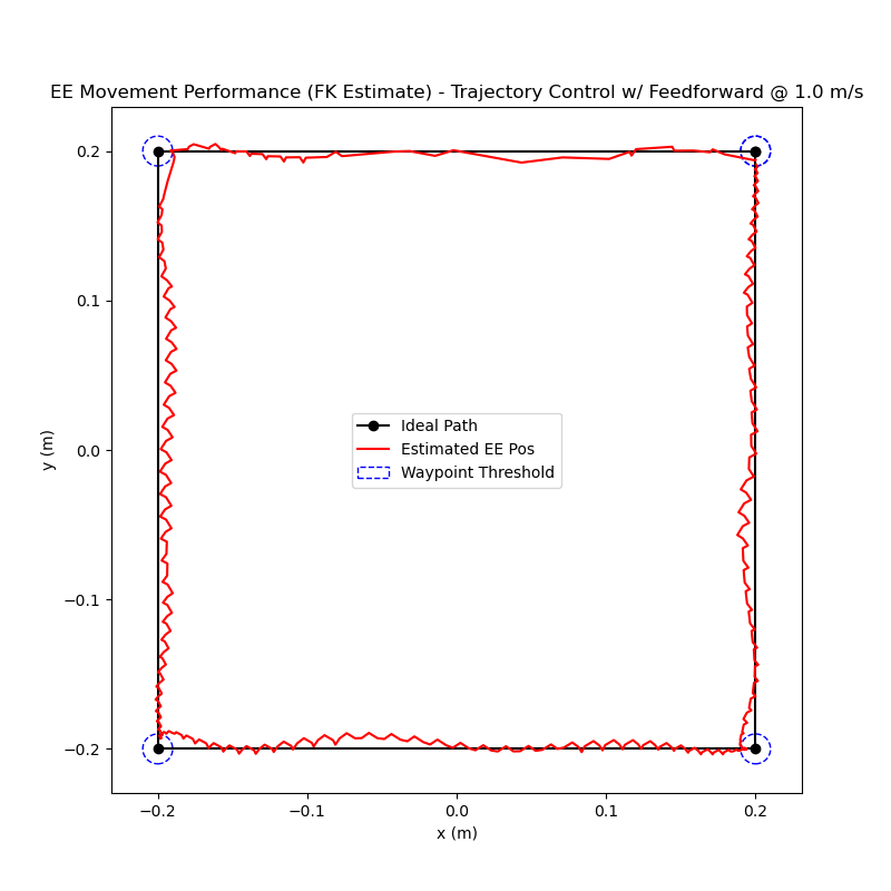 In order for the controller to function correctly, the position and velocity errors must accurately reflect the current state of the system. Since forward kinematics is used to estimate the current end-effector position, I did some testing to see how accurate this estimate is. For my testing, I moved the end-effector to various points in the workspace and logged the estimated and actual end-effector positions (actual position estimated using apriltags).