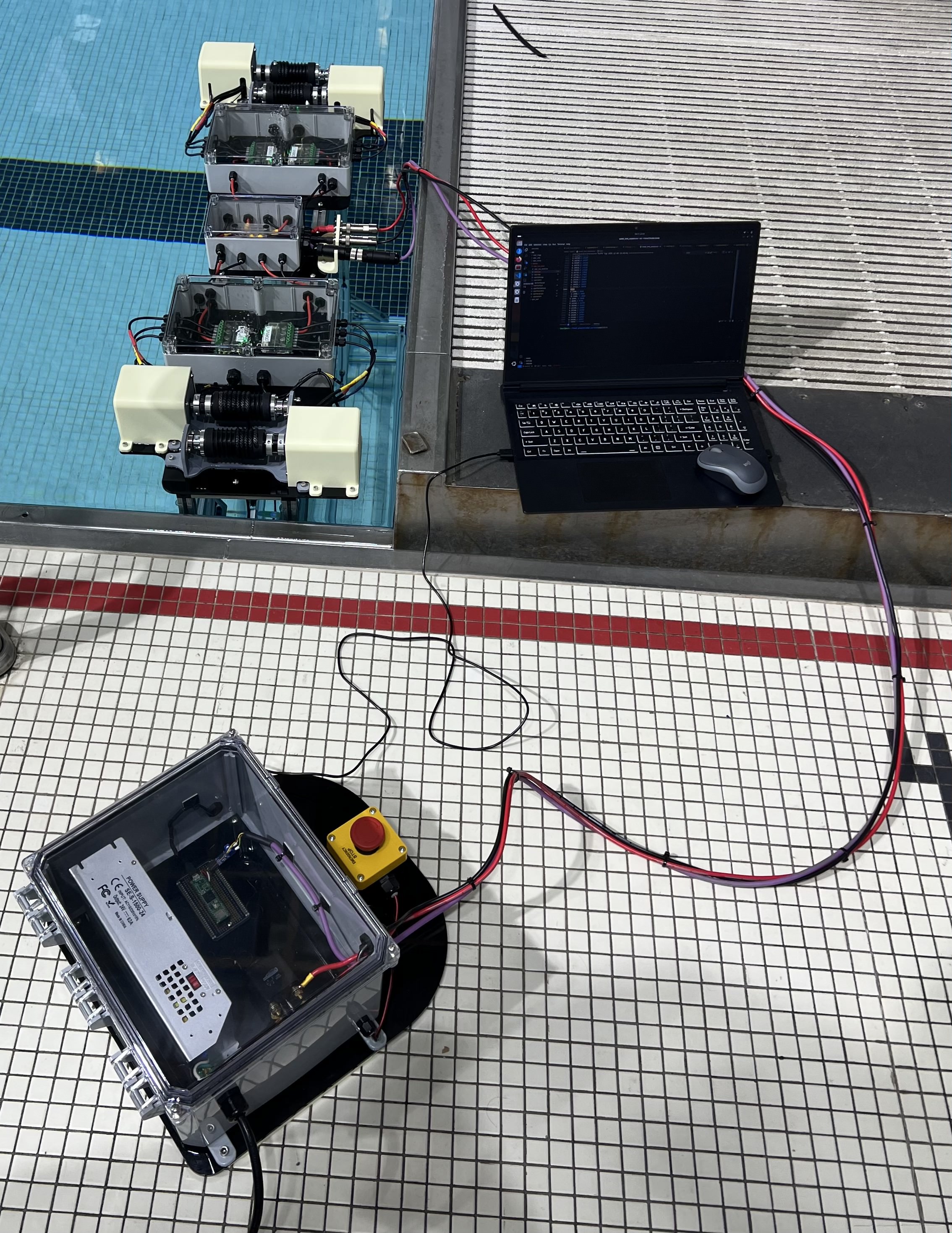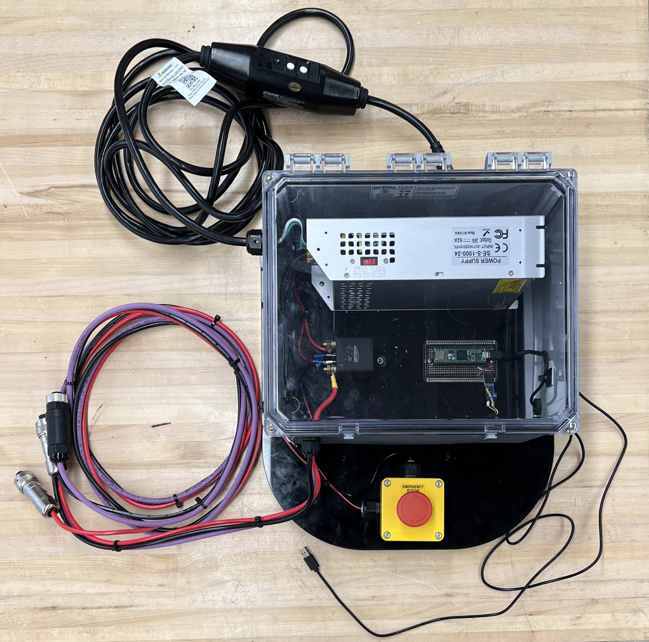Before testing in water, modifications were made to the design to protect the electronics from being damaged. Watertight enclosures were purchased and machined to accomodate all of the wiring necessary to connect the electronics. Also, the power supply was moved off of the robot frame where AC power from the wall outlet does not have to be as close to the water and the 24V, GND, and CAN cables can be plugged into their respective connectors on the frame.