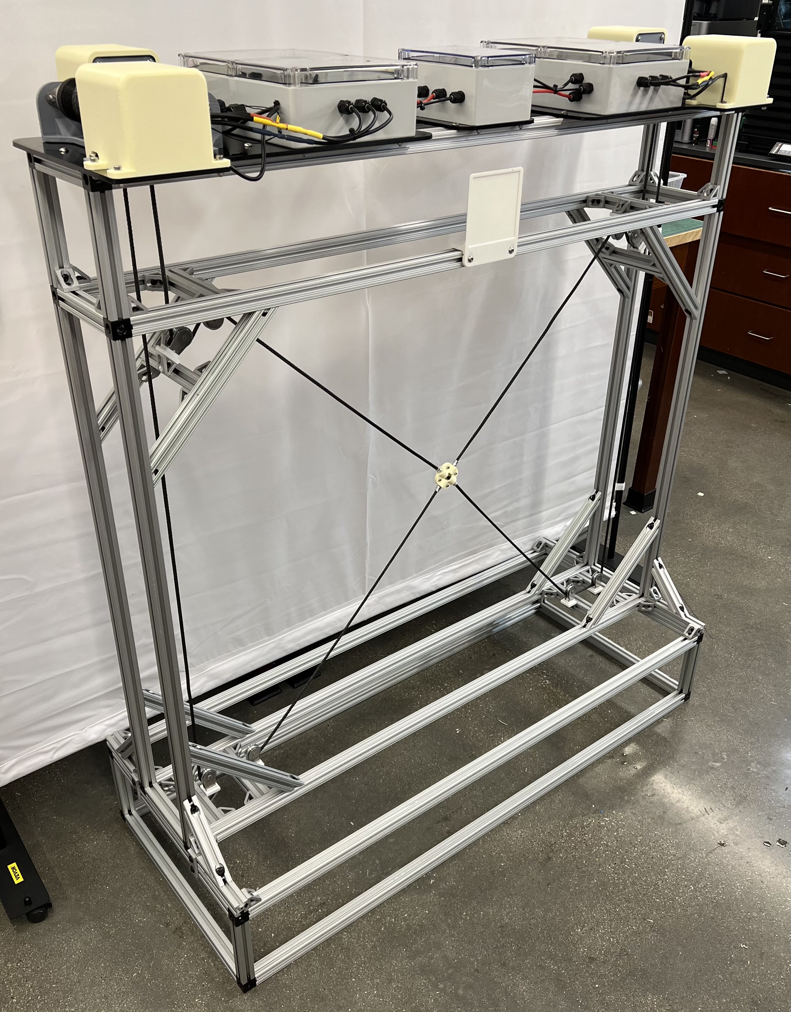 With these in mind, I decided on using 4 cables since that would allow for the control of 3 degrees of freedom, just in case the robot use case is altered in the future and control over orientation is necessary. I also added the motors, drivers, and other electronics on the top of robot, so I am able to make minimal changes before I am able to test this design in water. Also, since the frame is made from 8020 extrusion, if the design needs to be scaled up or down, only the necessary rails would need to be changed.
