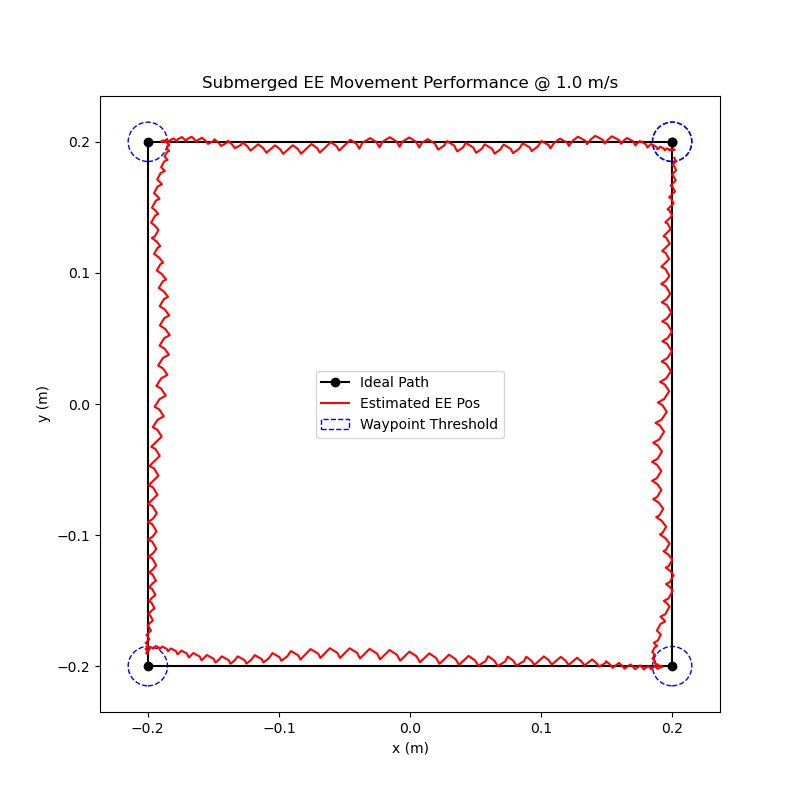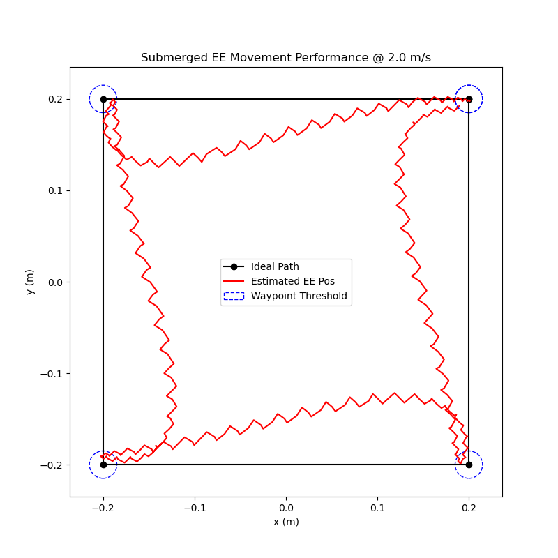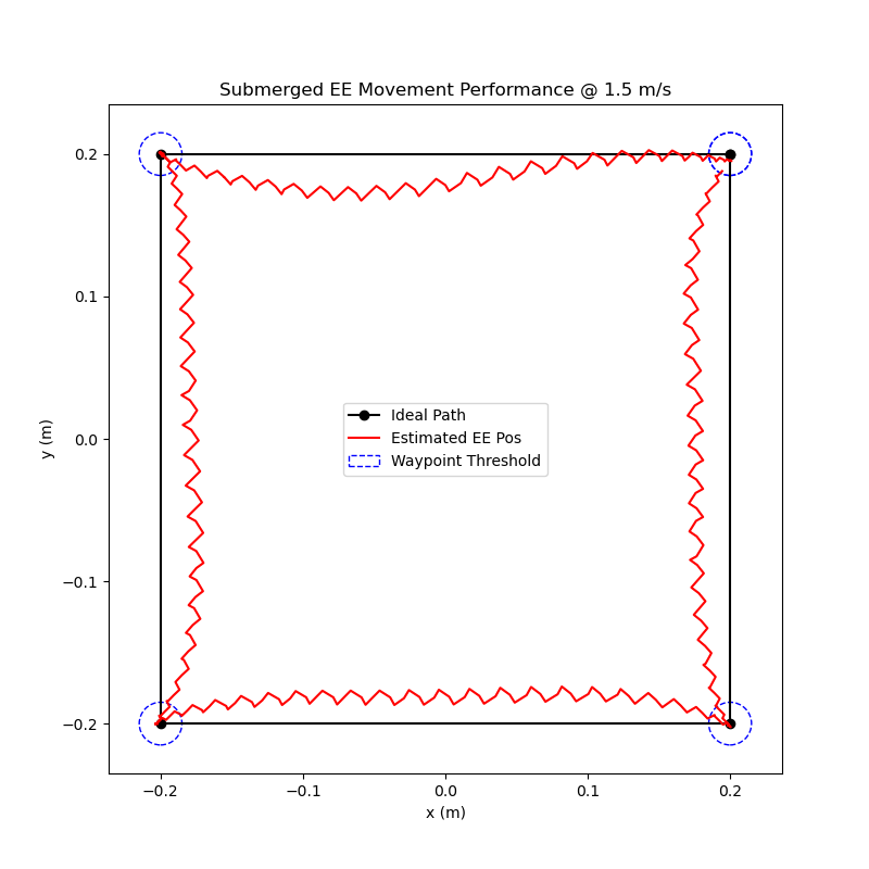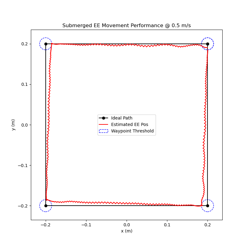 In order to compare how well the robot works while submerged, I completed the same waypoint tests as I did previously (results shown below). Overall, the results did not differ very much at all. This could be due to the small size of the end-effector, the motors being more powerful than necessary, or a combination of both. Either way, the results show that my design can serve it’s intended purpose of operating while submerged in water and has room to increase the end-effector size if necessary.